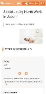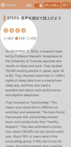 STEP 2で再生ボタンを押すと文章を読み上げます。そのまま全文を聞くことも可能ですが、一文ごとに一時停止をし、後に続いて声を出して読上げることをおすすめします。