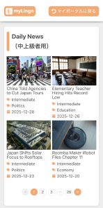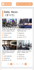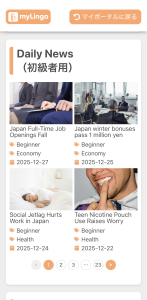 Daily Newsの一覧から教材をクリックするとレッスンがはじまります。教材は、Beginner(初級)、Intermediate(中級)、Advanced(上級)の3段階の難易度に分かれています。