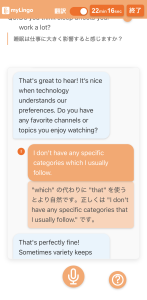 AI講師の言っていることがわからないときや返事の仕方がわからない時は「?」マークをクリックしてください。AI講師の音声聞きなおしボタン、日本語訳、それに対する回答例が表示されます。