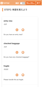 AI講師の音声聞きなおしボタン、日本語訳、それに対する回答例が表示されます。